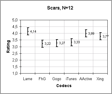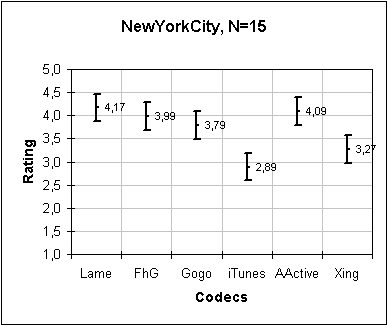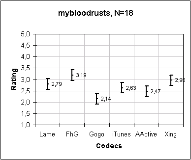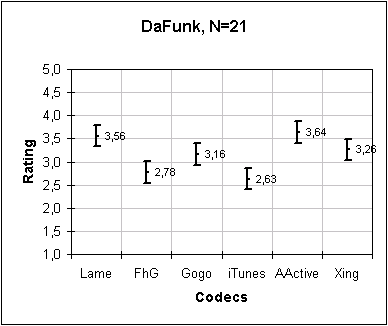 One codec can be said to rated better than another codec with 95% confidence if the bottom of its line segment is at or above the top of the competing codec's line segment. For example, in the DaFunk plot below, AudioActive is rated better than Gogo with 95% confidence. And AudioActive is rated better than FhG with greater than 95% confidence.