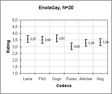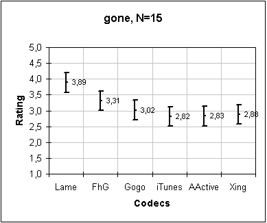 Artist: Die Apokalyptischen Reiter Title: Gone Album: All you need is Love Submitted by: Dibrom Extreme Metal/NWOSDM Results: In this sample, Lame wins by far. FhG comes at second place, close to the mess at the bottom where all other encoders are (with Gogo a little above). |