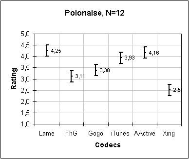 Artist: Friderick Chopin Title: Polonaise in D moll Op. 71, No. 1 Submitted by: AstralStorm Piano solo Results: Lame and AudioActive are tied at first place, followed closely by iTunes (!). Gogo comes at third, FhG at fourth and Xing fails badly. |