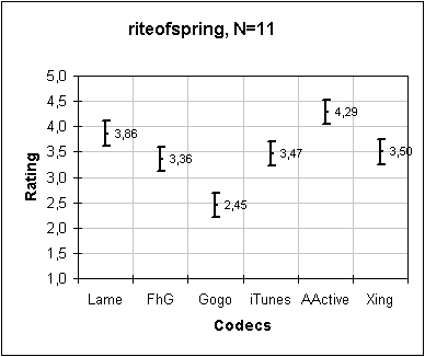 Then I performed an ANOVA analysis. The results are graphed below. Lame wins, followed by AudioActive, which is more or less followed by Xing, FhG and Gogo. Although iTunes is a little tied with Gogo, it's safe to say it lost.